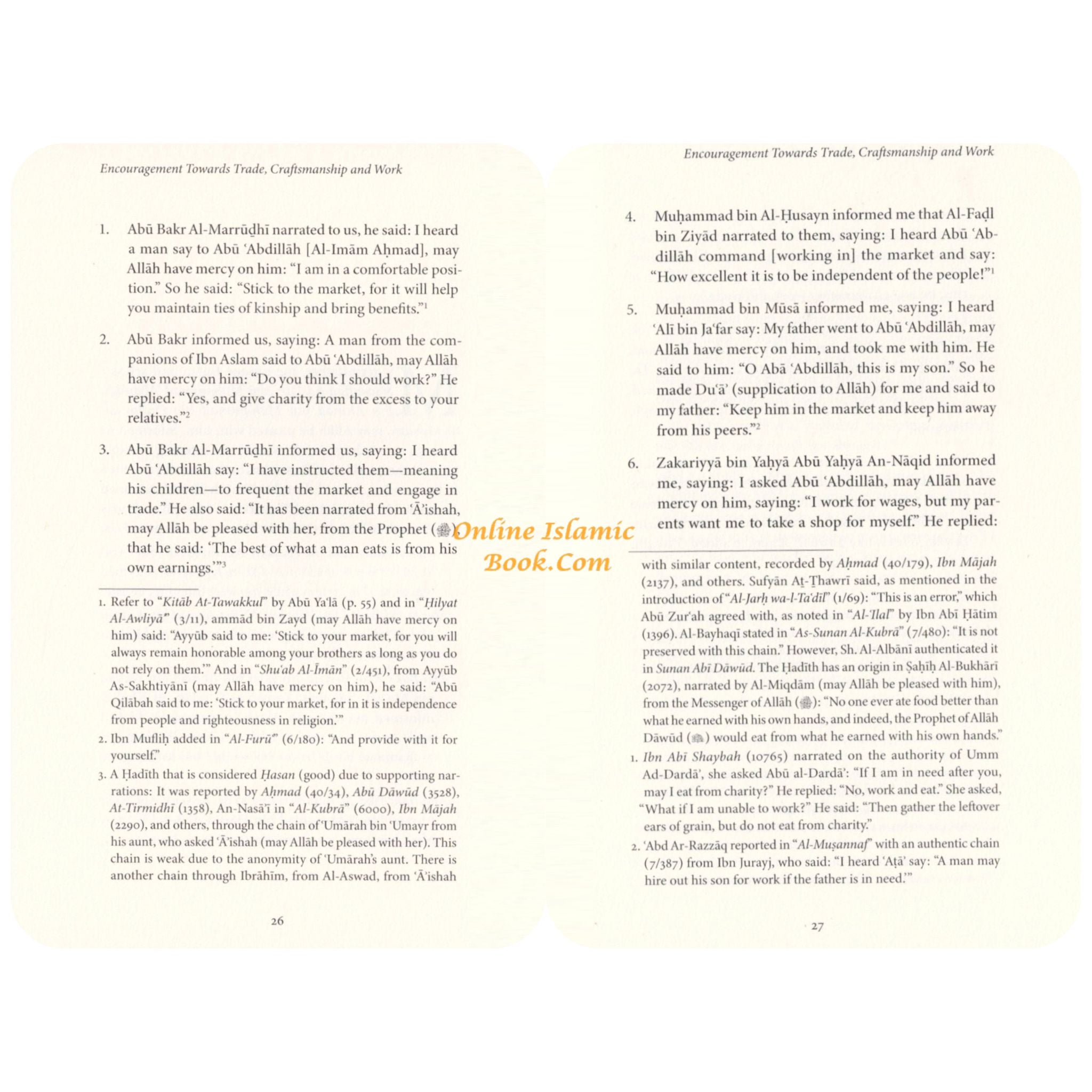 The Messenger of Allah (said: "No one has ever eaten better food than that which he has earned by working with his own hands. The Prophet of Allah, Dawid (David), used to eat from the earnings of his manual labour." Sabib Al-Bukhari # 2072 Know O Muslim, may Allah have mercy upon you, that in Islam, the concept of earning a livelihood through honest work is not just recommended but is highly encouraged, highlighting its role as an essential part of living a responsible and beneficial life. Seeking provision and engaging in business, trade, or craftsmanship is viewed as praiseworthy and beneficial to one's family and the community at large For this reason, the book before you is an important work highlighting the importance of earning a wholesome living and working to build a better future. The author gathers verses of the Qur'an, sayings of the Messenger of Allah statements and actions of esteemed scholars of Islam and narrations from the early generations that emphasise the value of business, trade and work and warn against thoor who abandon it and sit idly, Working, trading, and mastering a skill is a mark of a believer-by which not only does one benefit themself but benefits society; aids Islam and the Muslim community.