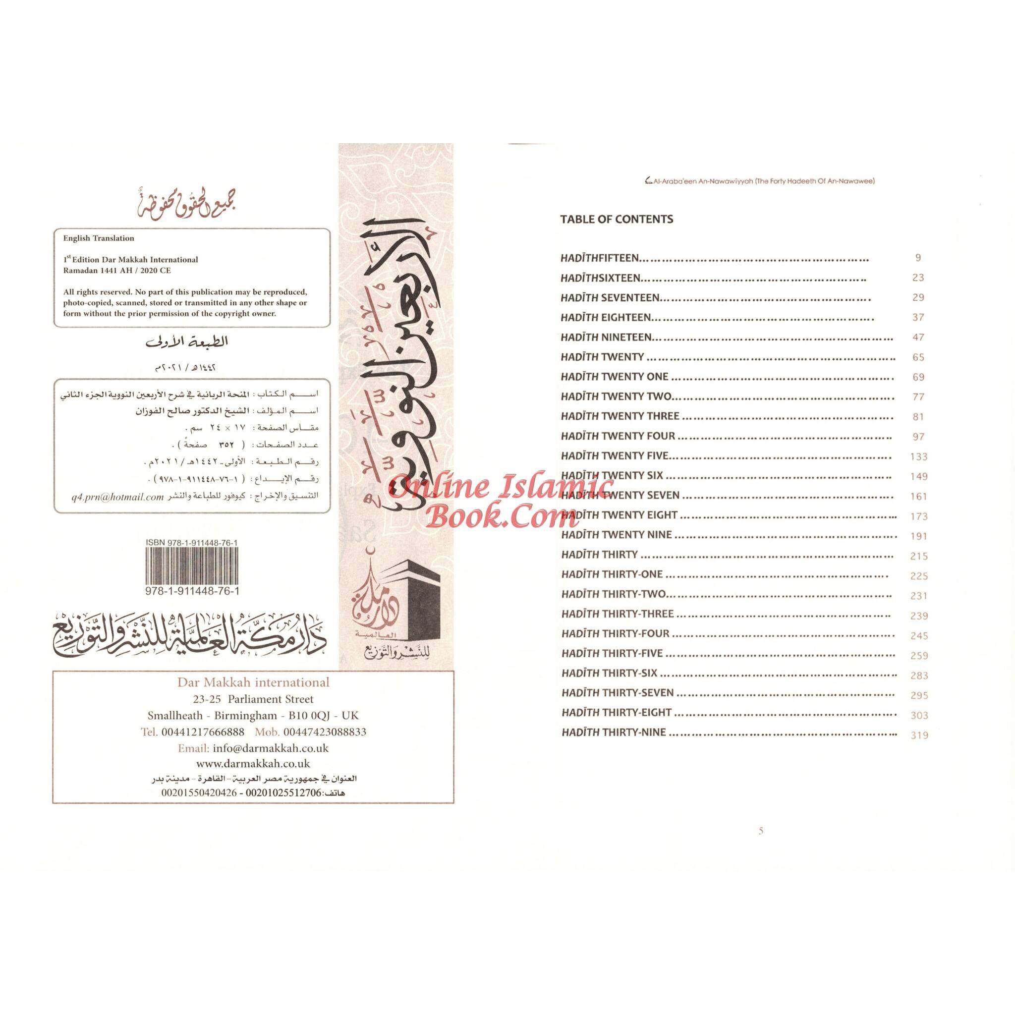 A thorough and educational book on Imam Nawawi's 40 hadiths, Shaykh Saalih al-Fawzaan's explanation of Imam Nawawi's 40 Hadiths, is available in two volumes. There are two volumes to the book, each of which contains 20 hadiths. Shaykh al-Fawzaan addresses the significance of hadiths, the life of Imam Nawawi, and the methodology of the 40 hadiths in the introduction to the first volume of the book. The subsequent chapters of the first volume go into great length about the 20 hadiths. Each hadith is thoroughly explained by Shaykh al-Fawzaan, including its chain of transmission, its significance, and any relevant legal decisions. He also offers commentary on the Sunnah and Quranic hadiths. It goes into great length about the remaining 20 hadiths, explaining each one's narration chain, significance, and legal implications. Anyone who wishes to understand more about the 40 hadiths of Imam Nawawi might check out Shaykh Saalih al-Fawzaan's interpretation of them in their two-volume set.This is the commentary of Al Arba ‘in An-Nawawwiyyah (The forty hadith of Imam An-Nawawi) by Imam Yahya Bin Sharaf Bun Hasan bin Husayn An-Nawawi. This commentary was given during lessons by the Shaykh Salih bin Fawzan bin Abdullah bin Al-Fawzan, after the fajr prayer at the Hammad As-Salamah masjid in Riyadh.