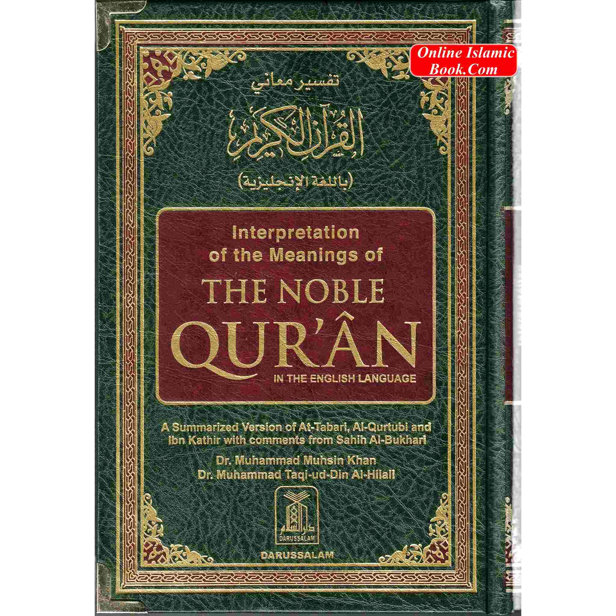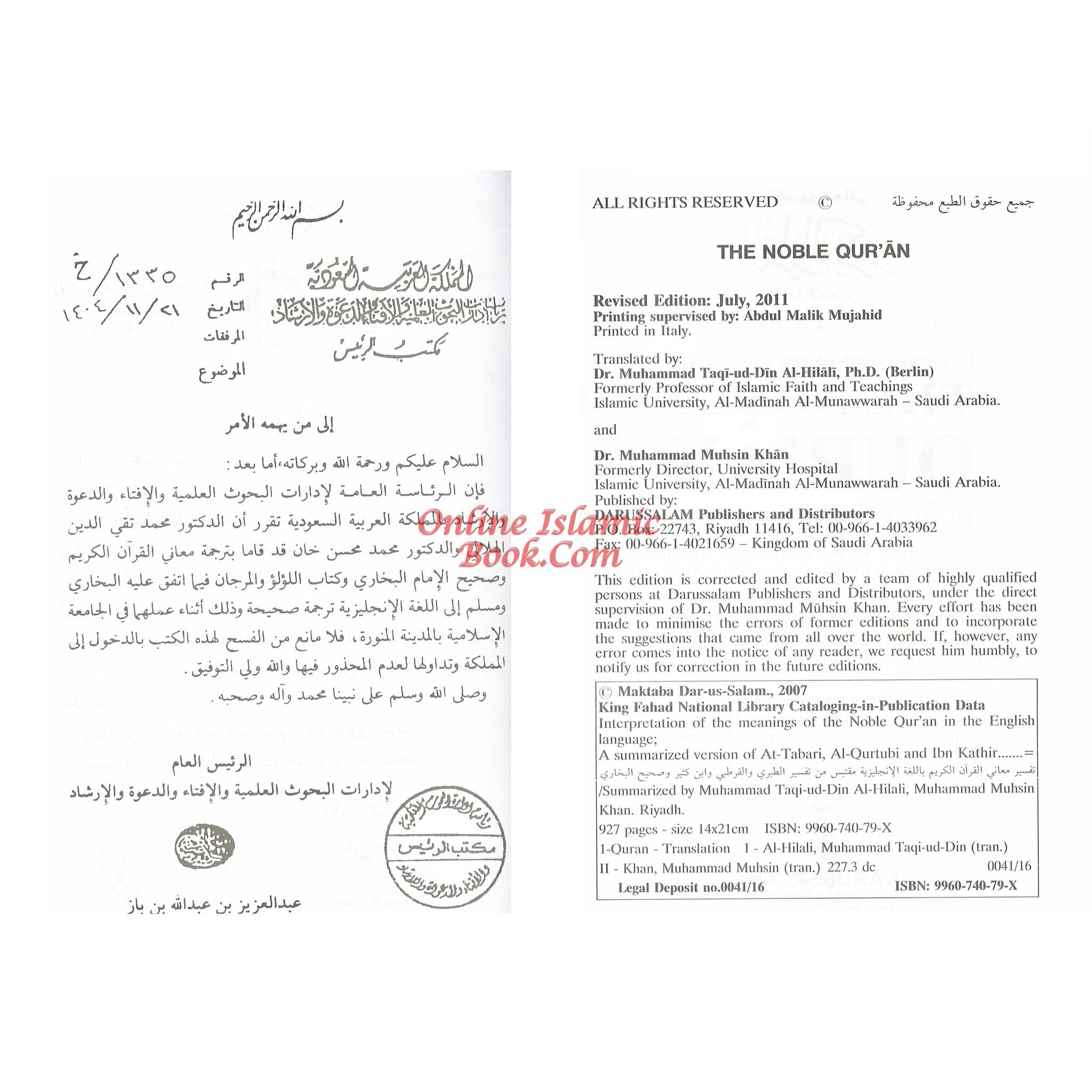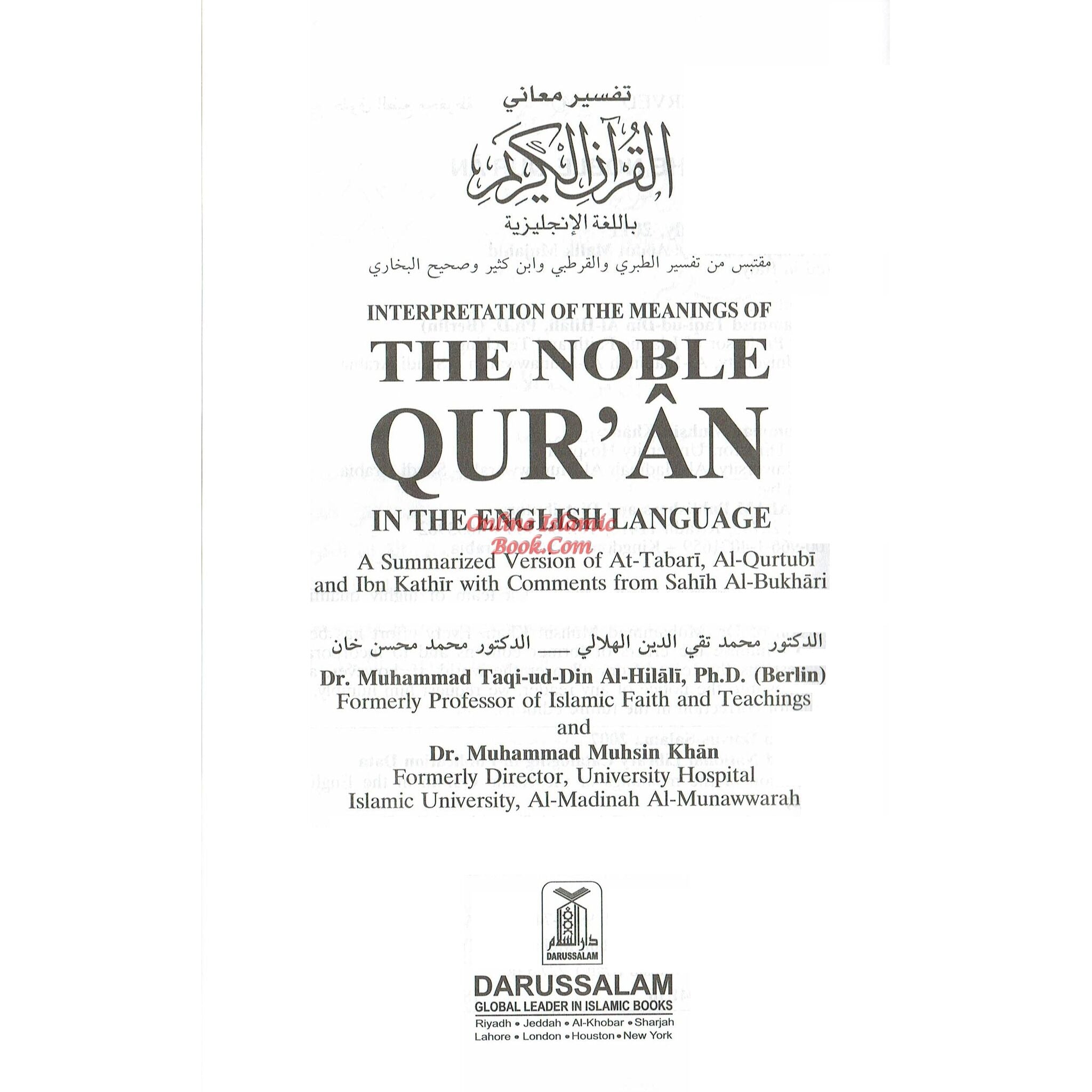 This edition's Arabic text of the Quran is drawn from the Mushaf Al-Madinah An-Nabawiyyah, which was published by the Mujamma' of King A.H. The Vice-Chancellor of the Islamic University gave the printing company the necessary instructions. This edition replaces the outdated Arabic text that was used in the book's earlier printing, which was done by Turkish calligrapher Sheikh Hamid al-Amadi and printed in the US and Turkey. In this edition, some Ahadith (proverbs of the Prophet Muhammad) and chapters from Sahih Al-Bukhari and other collections have been added or deleted. Certain additions, changes, and alterations have been made in order to enhance the English translation and guarantee that it accurately conveys the precise meanings of the Arabic text. The previous edition of the book cannot be reprinted or copied after the release of this updated edition. With the Arabic text and its English interpretation neatly side by side, this new version seeks to give readers a dependable and improved reading experience of the Noble Quran.